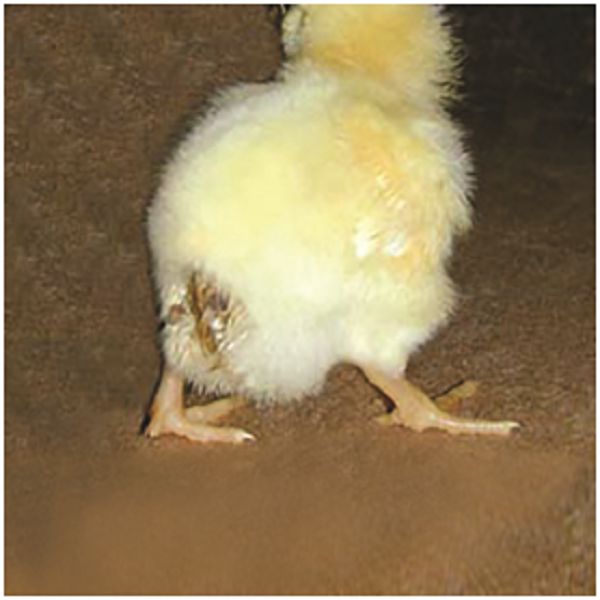 + Tiêu chảy phân trắng, trắng xanh, phân dính đít, thậm chí bịt kín, nút chặt hậu môn làm cho gia cầm mới nở không ỉa được, sinh chướng hơi, bụng căng tròn rồi chết.