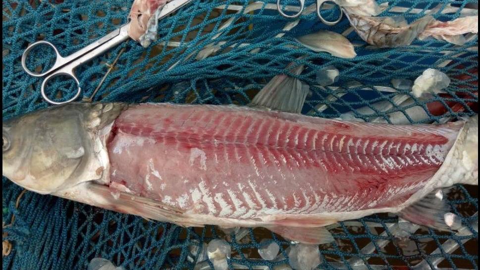 Tóm lại hệ thống cơ dưới da xuất huyết và trong xoang cơ thể, gan, thận, lá lách xuất huyết. Ruột không có thức ăn, thành ruột xuất huyết nhưng không hoại tử (thành ruột còn tương đối chắc chắn, không thối nát). Máu biến đổi, khi cá nhiễm bệnh, hổng cầu, huyết tương và urê đều giảm sau 4-5 ngày, sau 8 ngày hổng cầu, huyết tương, hemoglobin giảm tới mức thấp nhất, nhưng glucose máu không thay đổi.