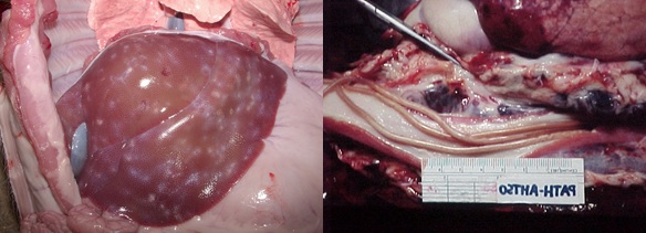 Khi mổ khám có thể gặp những tổn thương trên gan là những nốt màu trắng. Trong lòng ruột có giun trưởng thành.