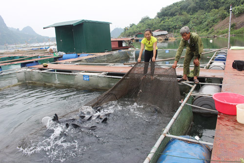 Chăm sóc: Cần làm sàn ăn cho cá, cách làm này sẽ quản lý được lượng thức ăn và nắm được sức tăng trọng của cá. Liều lượng mồi cho ăn hằng ngày bằng 5-7% trọng lượng cơ thể cá. Thức ăn của cá là cá tạp xay nhỏ hoặc cắt khúc vừa miệng cho cá ăn. Thức ăn tự chế gồm 50% cám + 50% cá tạp xay nhỏ, ép thành viên cho cá ăn. Cần cho cá ăn thêm thức ăn công nghiệp để bổ sung hàm lượng đạm. Một ngày cho cá ăn 3 lần vào lúc sáng, chiều và tối. Lượng thức ăn