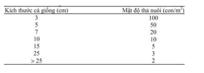 + Mật độ thả nuôi: Mật độ nuôi trung bình 30 – 50 con/m2, không nên nuôi quá dày ảnh hưởng đến sức lớn của cá. Mật độ nuôi tùy thuộc vào kích cở cá giống thả, có thể thực hiện theo bảng đề nghị sau: