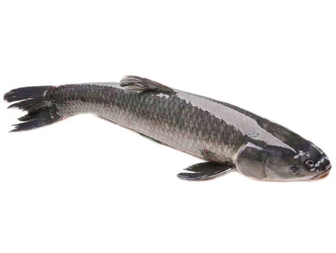 - Moina vẫn là thức ăn tốt nhất đối với cá bột trong 3 tuần lễ đầu. Rhizopus arrhizus hay đạm đơn bào (125µm) được sản xuất từ kỹ thuật lên men sử dụng dầu cọ làm nguồn carbon chính. Giai đoạn cá lớn thường cho ăn cá tạp, phụ phế phẩm từ các nhà máy chế biến đầu tép, tôm, ếch, cá hay thức ăn chế biến và thức ăn viên. Cá lớn nhanh vào mùa xuân – hè.